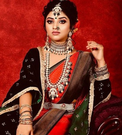 शादी के दिन महालक्ष्मी ने चमकीले हरे रंग के कढ़ाई वाले ब्लाउज के साथ एक लाल और सुनहरी रेशम की साड़ी पहनी थी